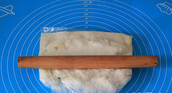 - 到了最最考验技巧的一步了,请大家擦亮双眼跟我做,把蒸好的土豆放在保鲜袋里面,用擀面杖压成土豆泥(南方的厨友们,莫慌,我知道你们有可能不认识也没有擀面杖,但你们可以用勺子面把土豆压成泥)