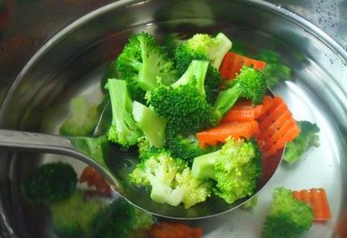 - 蒸锅中的水不用倒掉,可重复利用来焯熟西兰花(厨房小白们,请跟我念这个字“焯”chao第一声,意思是把蔬菜放到沸水中略微一煮就捞出来);玉米粒和青豆也依次焯一下开水
